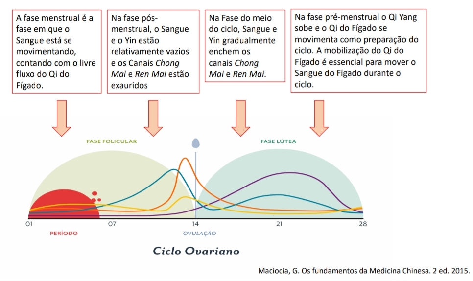 Se compararmos a medicina Ocidental com a MTC podemos dizer que a primeira fase do ciclo menstrual ( fase folicular, antes da ovulação) onde temos o predomínio de estrogênio é YIN. A ovulação é o pico de YANG máximo. A pessoa trona-se mais expansiva, a libido aumenta, a temperatura do corpo sobe. A segunda fase do ciclo (fase lútea, após ovulação) onde temos o predomínio de progesterona é YANG. O ciclo menstrual também pode ser entendido como as fases da lua. A lua influencia as águas, as marés e as nossas emoções.
